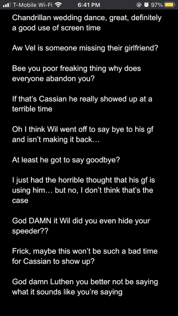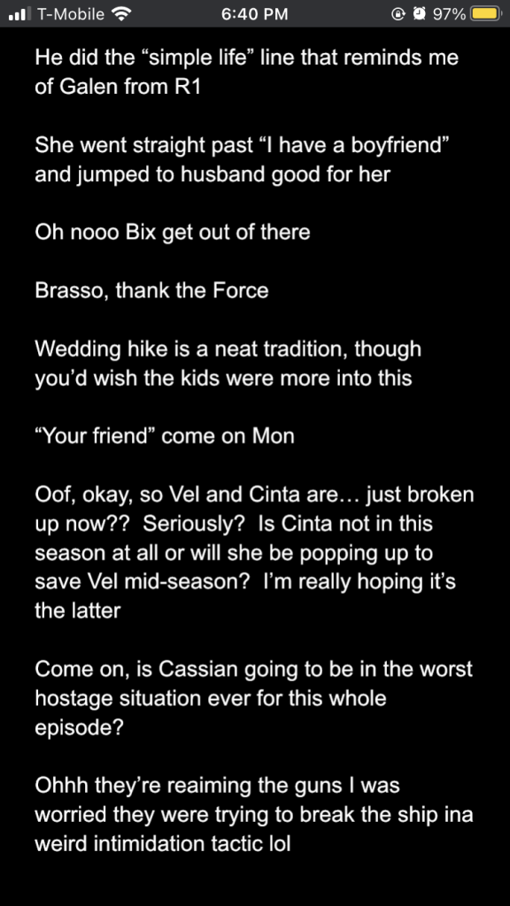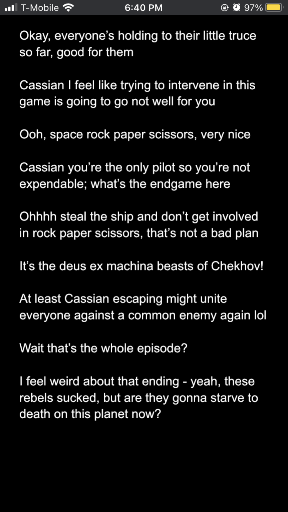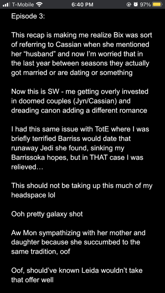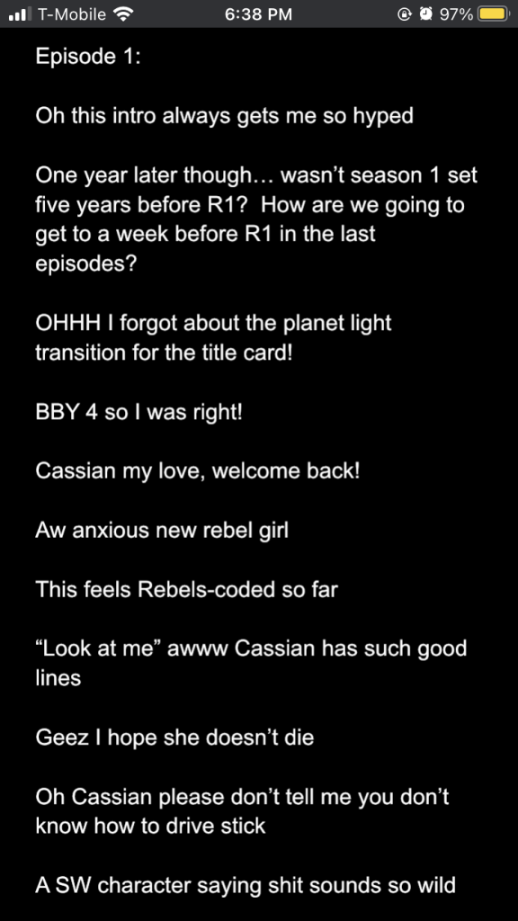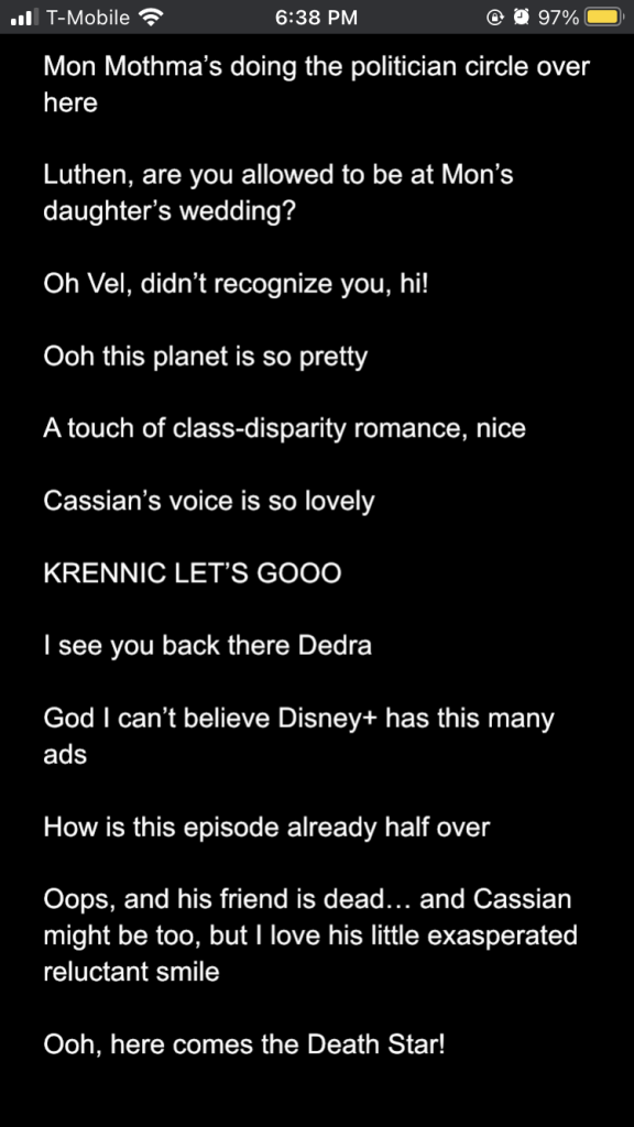 Posted inStar Wars Sunday Andor season 2 episodes 1-3: a slow burn with rising stakes Posted by By Sophie Montecalvo April 27, 2025 Here are my live reaction notes from the first three episodes! Pages 1 2 Sophie Montecalvo If you enjoy hearing ramblings about Jedi, various books, Marvel media, and random 80's horror movies, this is the place for you! Come for the Greek mythology references, stay for the Star Wars ones! View All Posts Post navigation Previous Post Call Me By Your Name: the cloudy realm of first loveNext PostAndor season 2 episodes 4-6: raise my hopes just to shatter them