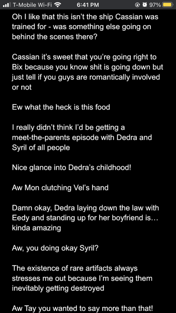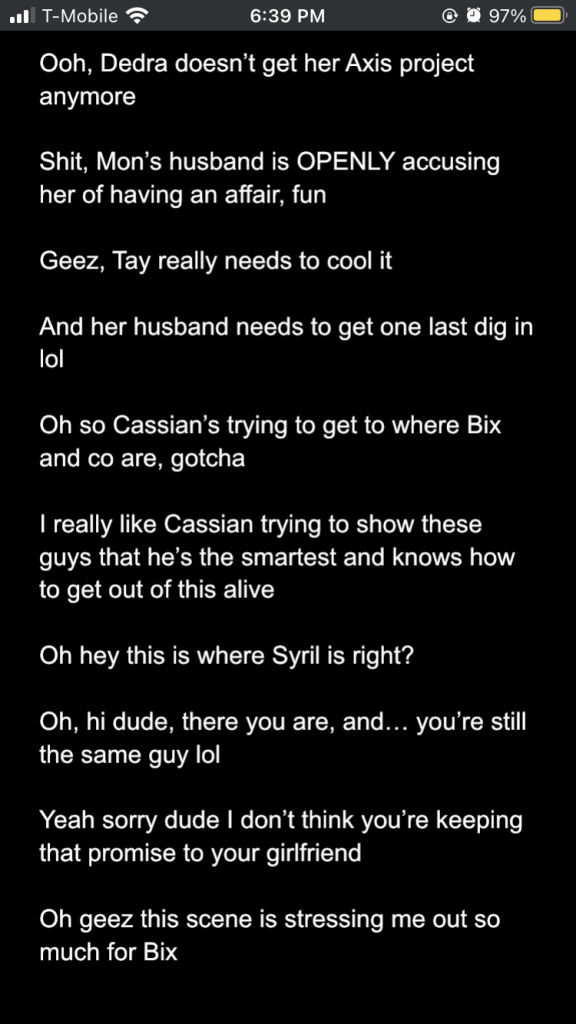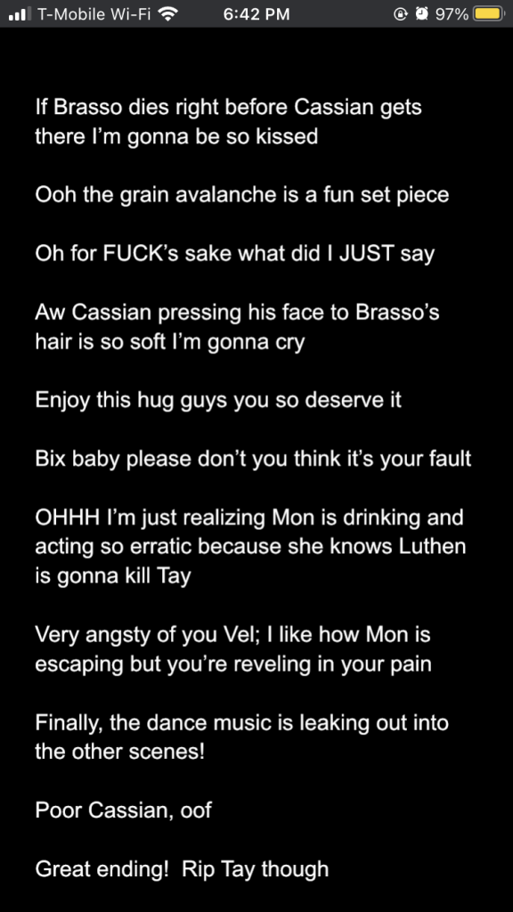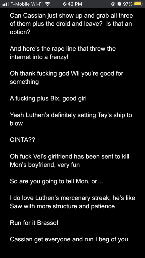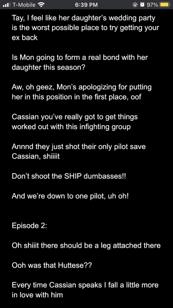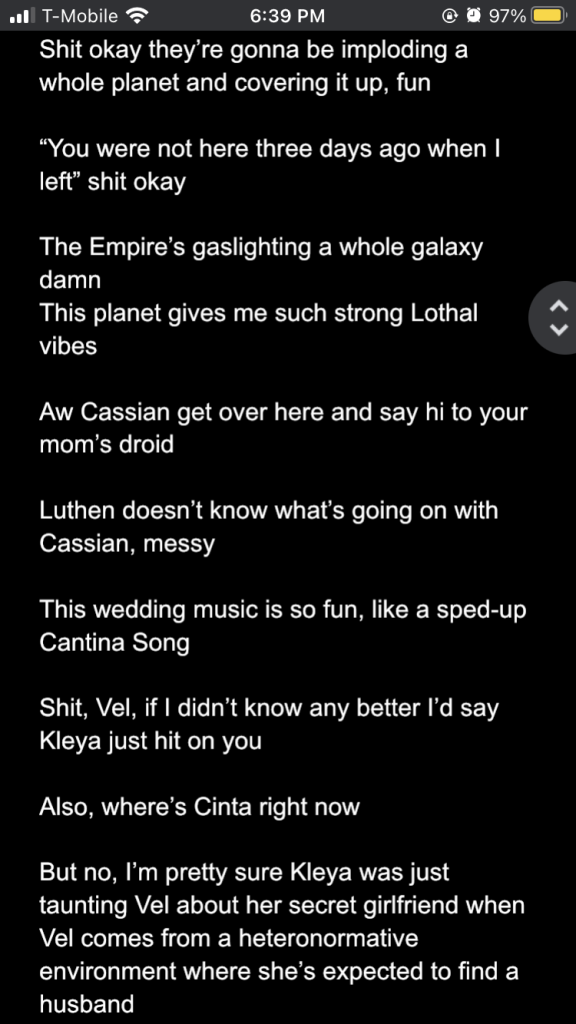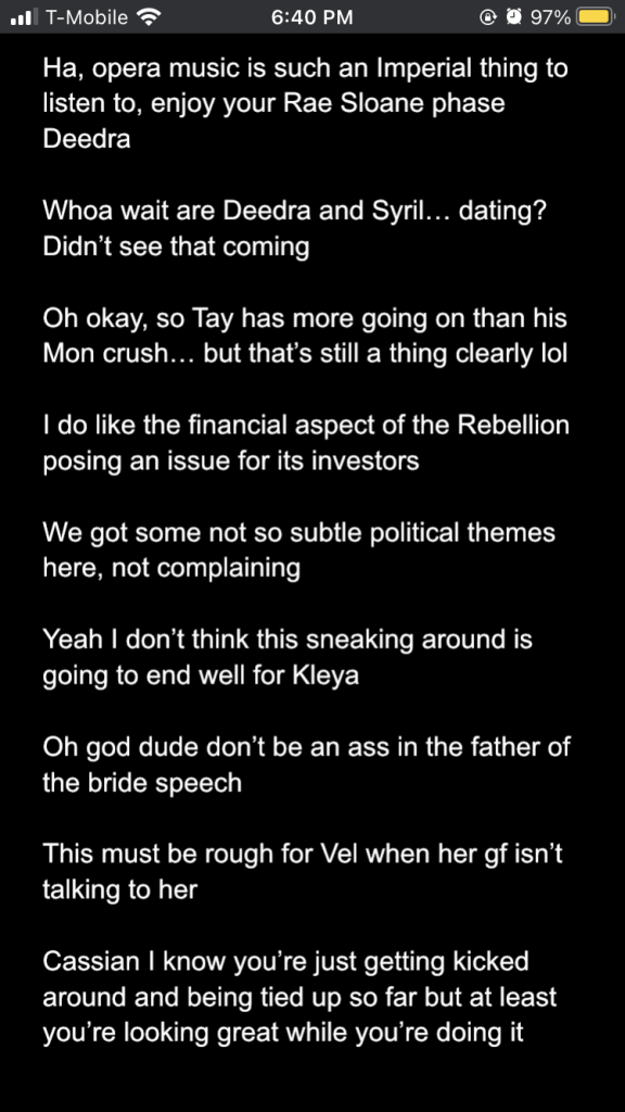 Posted inStar Wars Sunday Andor season 2 episodes 1-3: a slow burn with rising stakes Posted by By Sophie Montecalvo April 27, 2025 Here are my live reaction notes from the first three episodes! Pages 1 2 Sophie Montecalvo If you enjoy hearing ramblings about Jedi, various books, Marvel media, and random 80's horror movies, this is the place for you! Come for the Greek mythology references, stay for the Star Wars ones! View All Posts Post navigation Previous Post Call Me By Your Name: the cloudy realm of first loveNext PostAndor season 2 episodes 4-6: raise my hopes just to shatter them